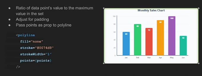 .map()to loop through the data array and create an SVG<rect>element for each bar. The bar’s height is calculated proportionally based on the maximum value.
